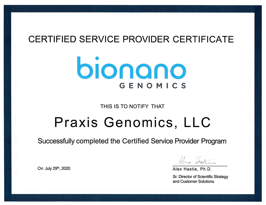 The Saphyr® Whole Genome Optical Mapping Instrument from Bionano Genomics provides a high level assessment of breaks, rearrangements and repeat expansions in the DNA that cannot be seen using sequencing
